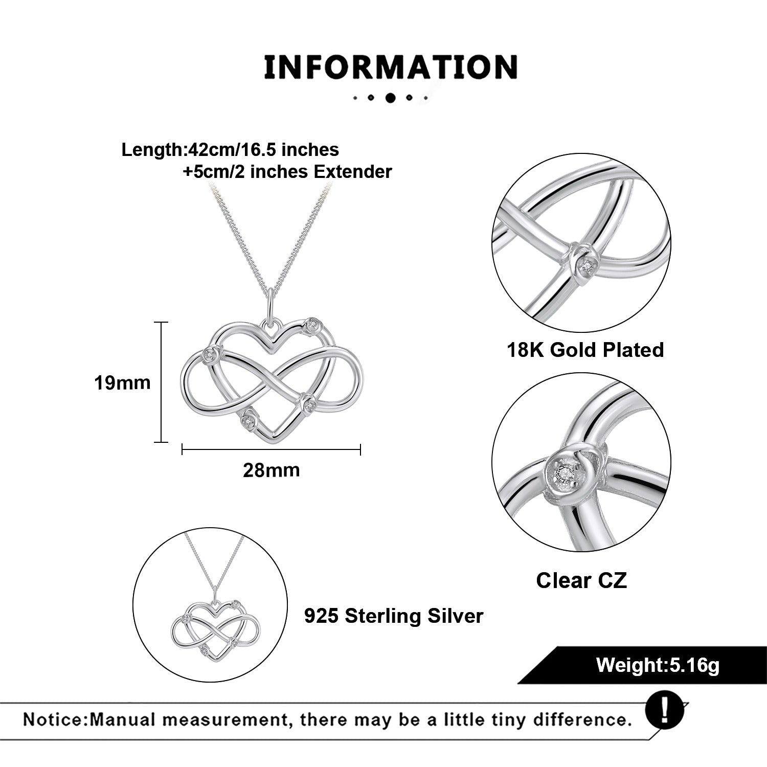 This exquisite necklace features a 24mm heart-shaped pendant crafted from fine sterling silver and a protective rhodium plating. The heart is beautifully intersected by the graceful curve of an infinity symbol, signifying eternal connection and devotion. Both the heart and the infinity symbol are brilliantly accented with sparkling crystals that catch the light with every movement.