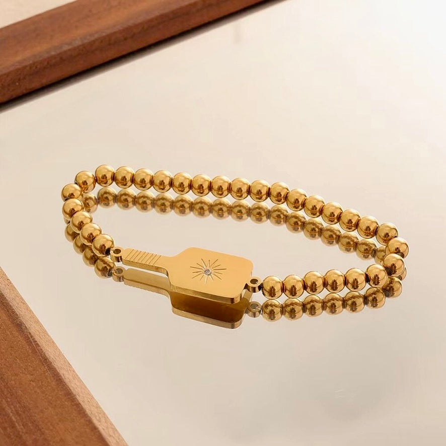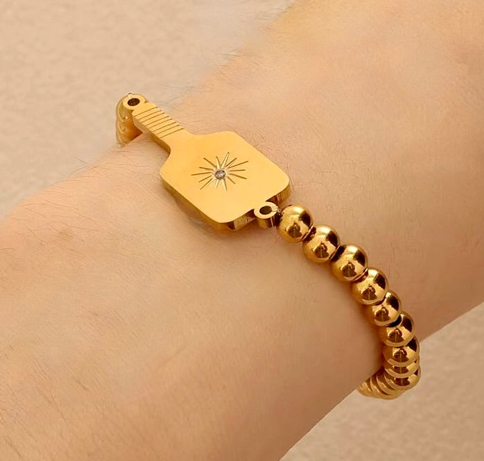 ✨ Details • .25" gold-plated beads on a stretch bracelet • Pickleball paddle charm measures 1.2" long • Crystal center with starburst impact effect • Gold plating over brass • Waterproof & everlasting finish • Sport-friendly and water-resistant • Original PickleBelle® design