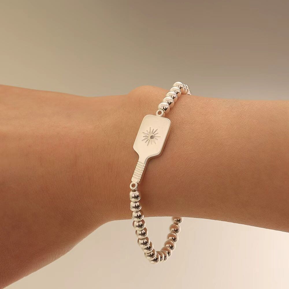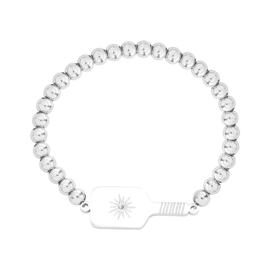 Made with .25" silver beads on a comfortable stretch bracelet, it offers a snug, athletic fit that stays put during play while looking polished off the court. The 1.2" pickleball paddle charm features a sparkling crystal set in the center of a radiant starburst impact design, capturing the energy of your favorite game in a sleek, wearable statement.