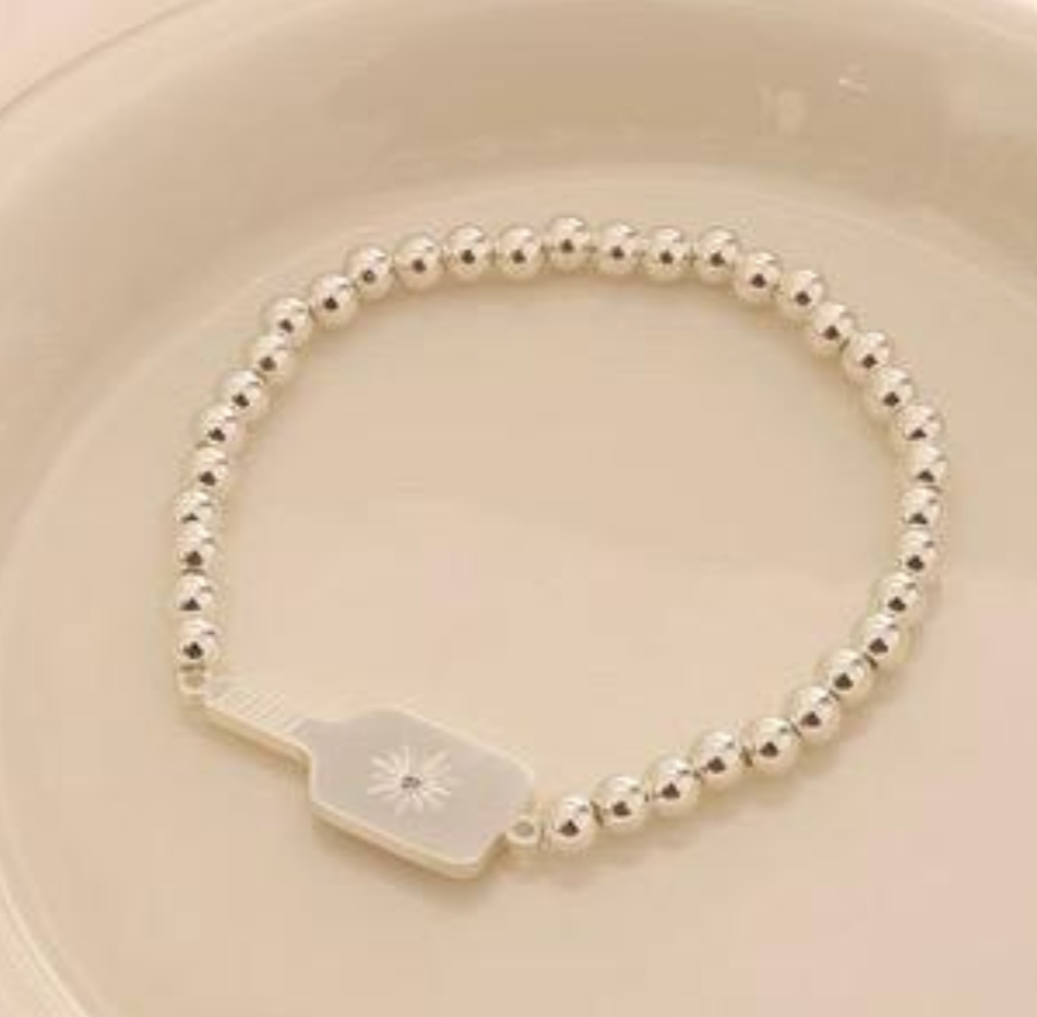 ✨ Details • .25" silver-plated beads on a stretch bracelet • Pickleball paddle charm measures 1.2" long • Crystal center with starburst impact effect • Silver plating over brass • Waterproof & everlasting finish • Sport-friendly and water-resistant • Original PickleBelle® design