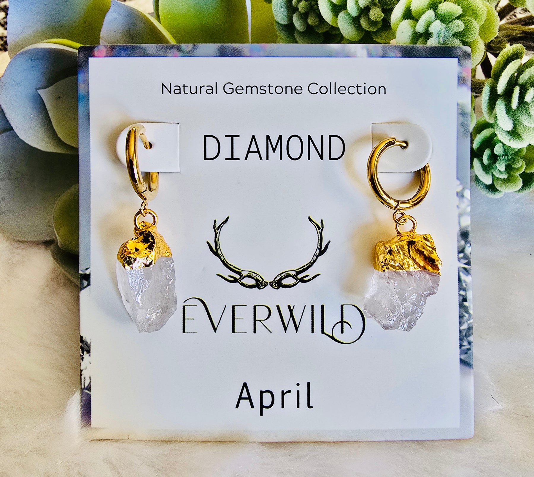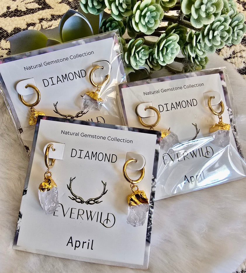 Celebrate an April birthday with the Raw Natural Gemstone Nugget Birthstone earrings, featuring exquisite raw diamond-like quartz gemstones. Each pair showcases a natural, unpolished nugget, approximately 1/2 inch in diameter, capped with 14K gold plating. These earrings are a perfect as a meaningful birthday gift, symbolizing the elegance and significance of the birthstone.