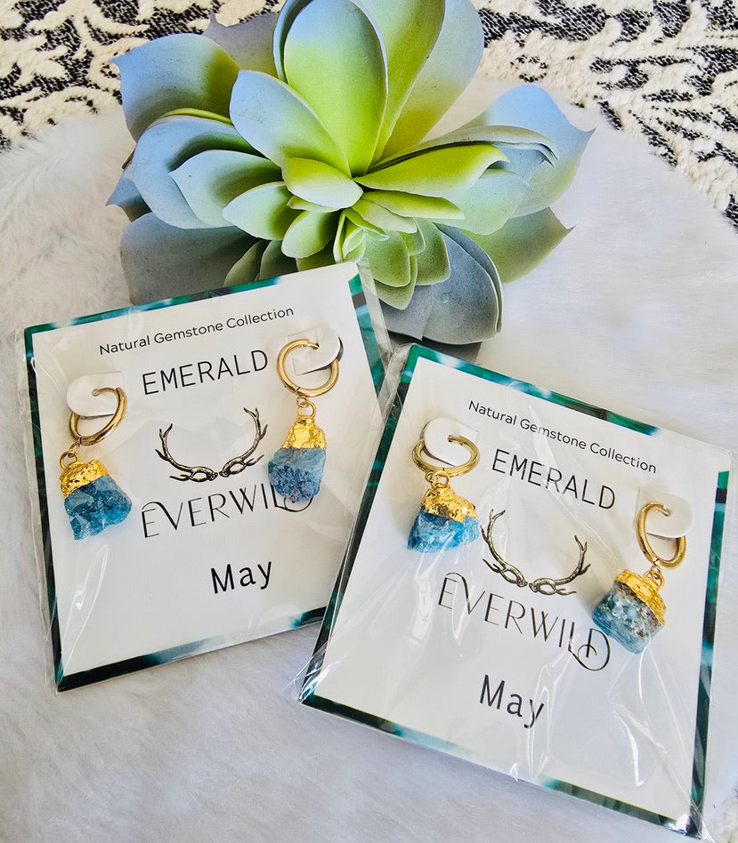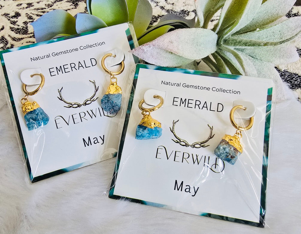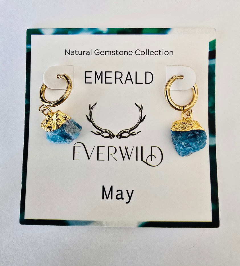 Celebrate a May birthday with the Raw Natural Gemstone Nugget Birthstone earrings, featuring exquisite raw emerald-like quartz gemstones. Each pair showcases a natural, unpolished nugget, approximately 1/2 inch in diameter, capped with 14K gold plating. These earrings are a perfect as a meaningful birthday gift, symbolizing the elegance and significance of the birthstone.