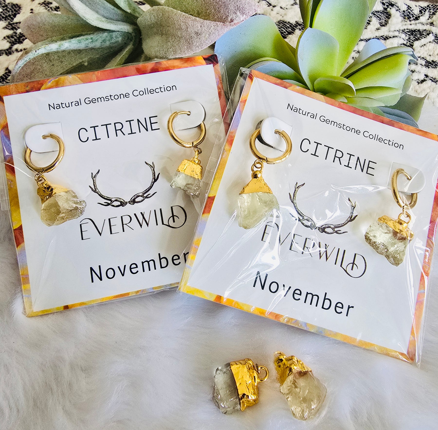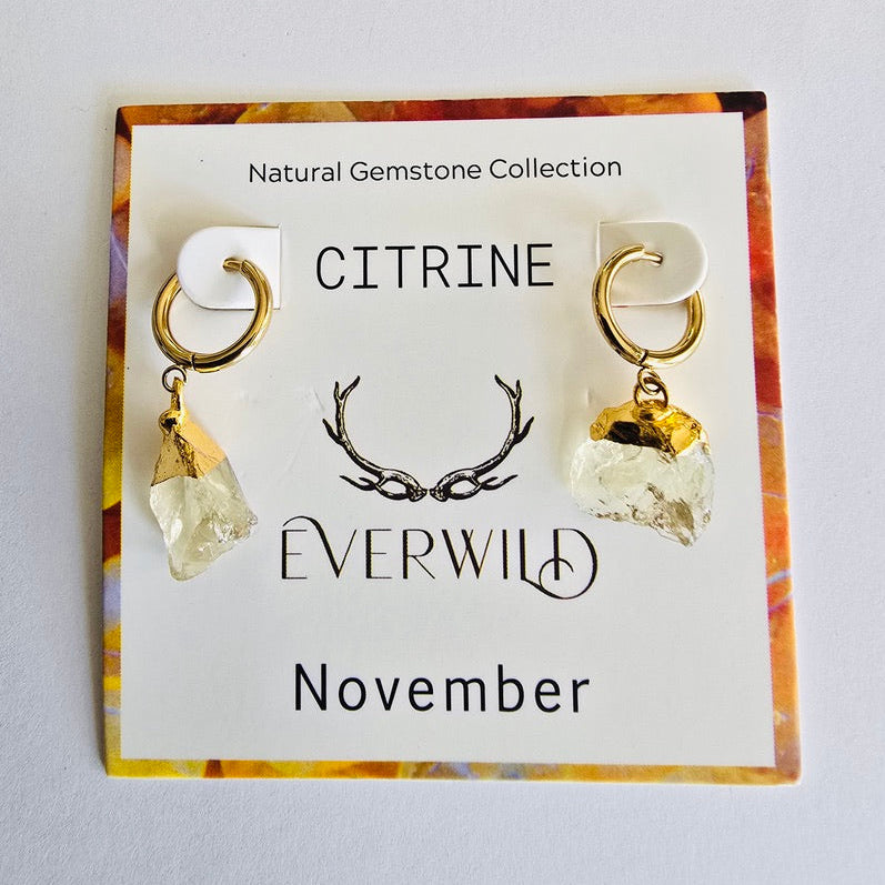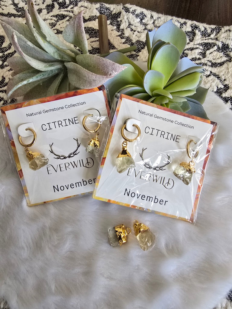 Celebrate a November birthday with the Raw Natural Gemstone Nugget Birthstone earrings, featuring exquisite raw Citrine-like gemstones. Each pair showcases a natural, unpolished nugget, approximately 1/2 inch in diameter, capped with 14K gold plating. These earrings are a perfect as a meaningful birthday gift, symbolizing the elegance and significance of the birthstone.