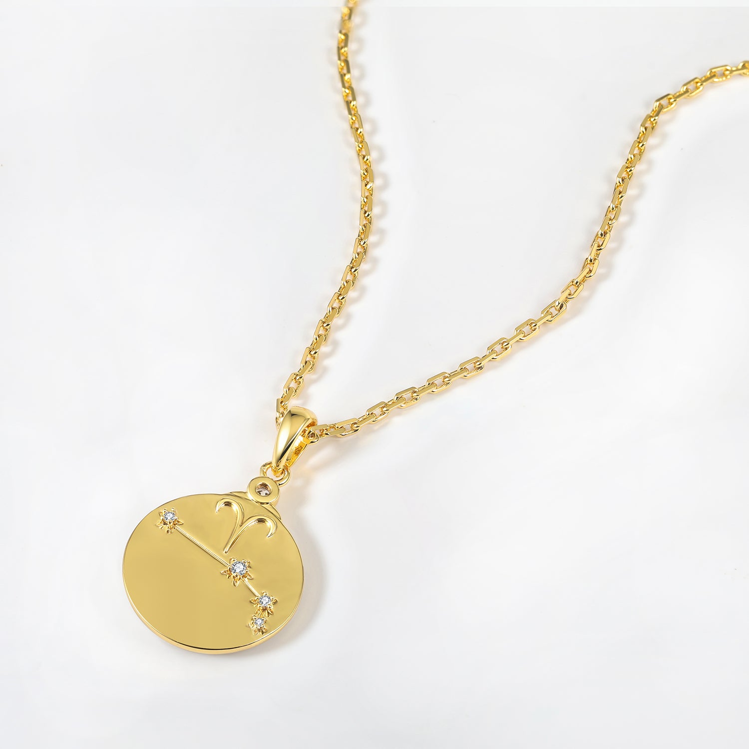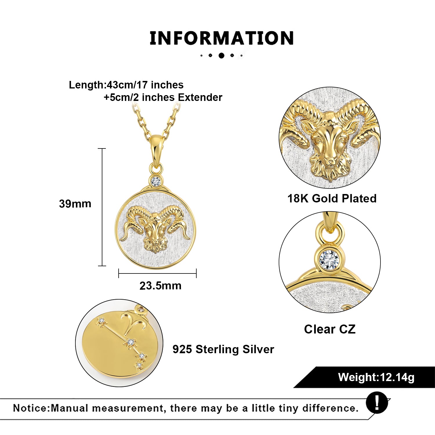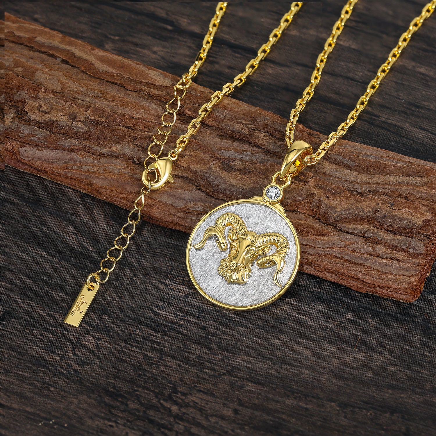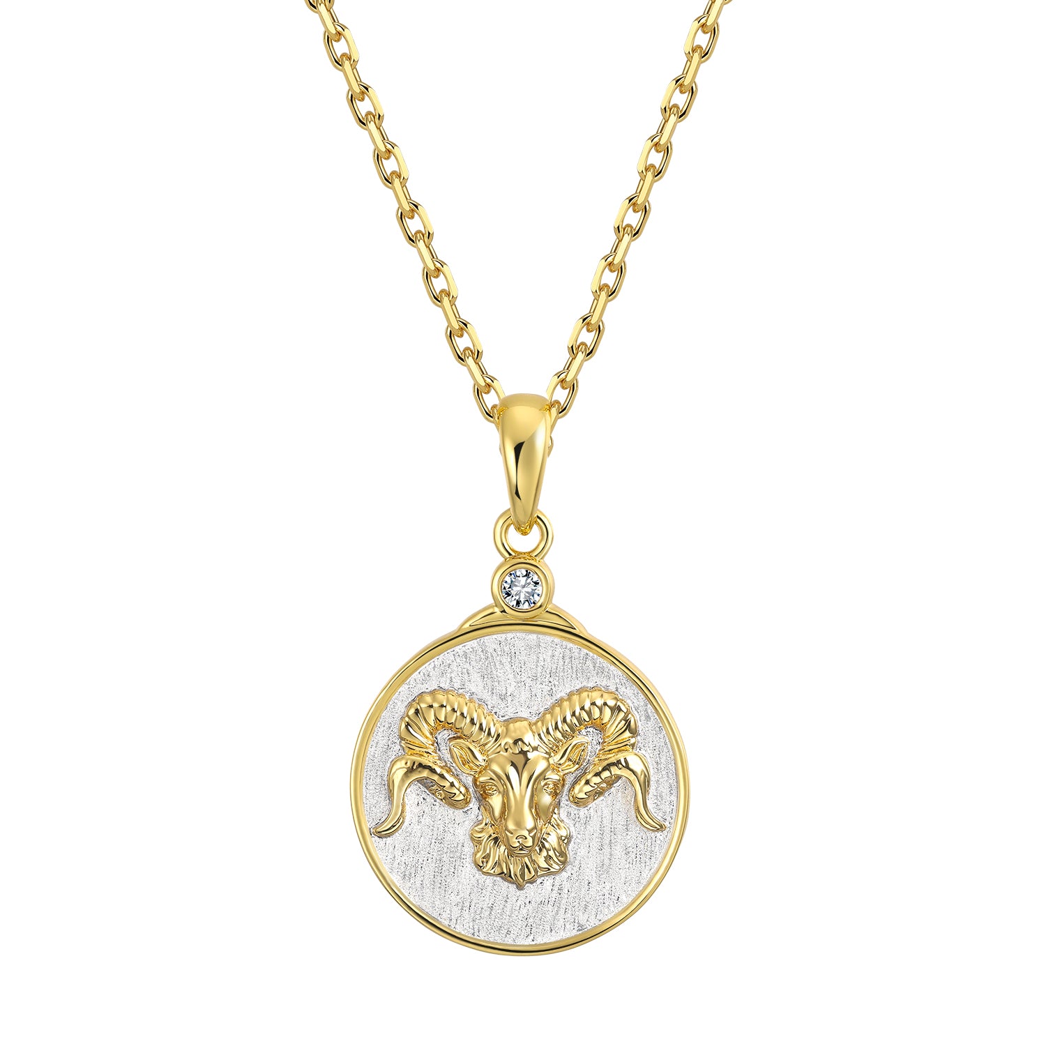Our Wild Aries features a detailed rams head with curving horns in gold on a sterling silver background- stunning! The reverse side shows the constellation set with crystal 'stars' and the astrological symbol as well.