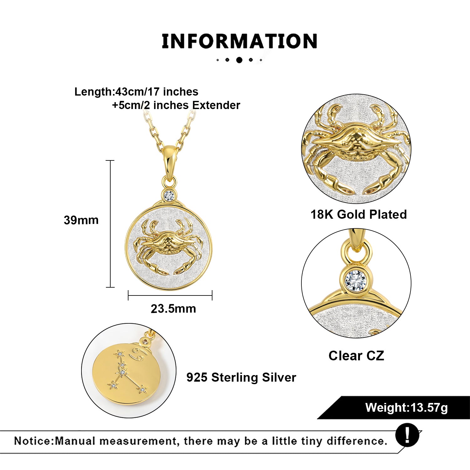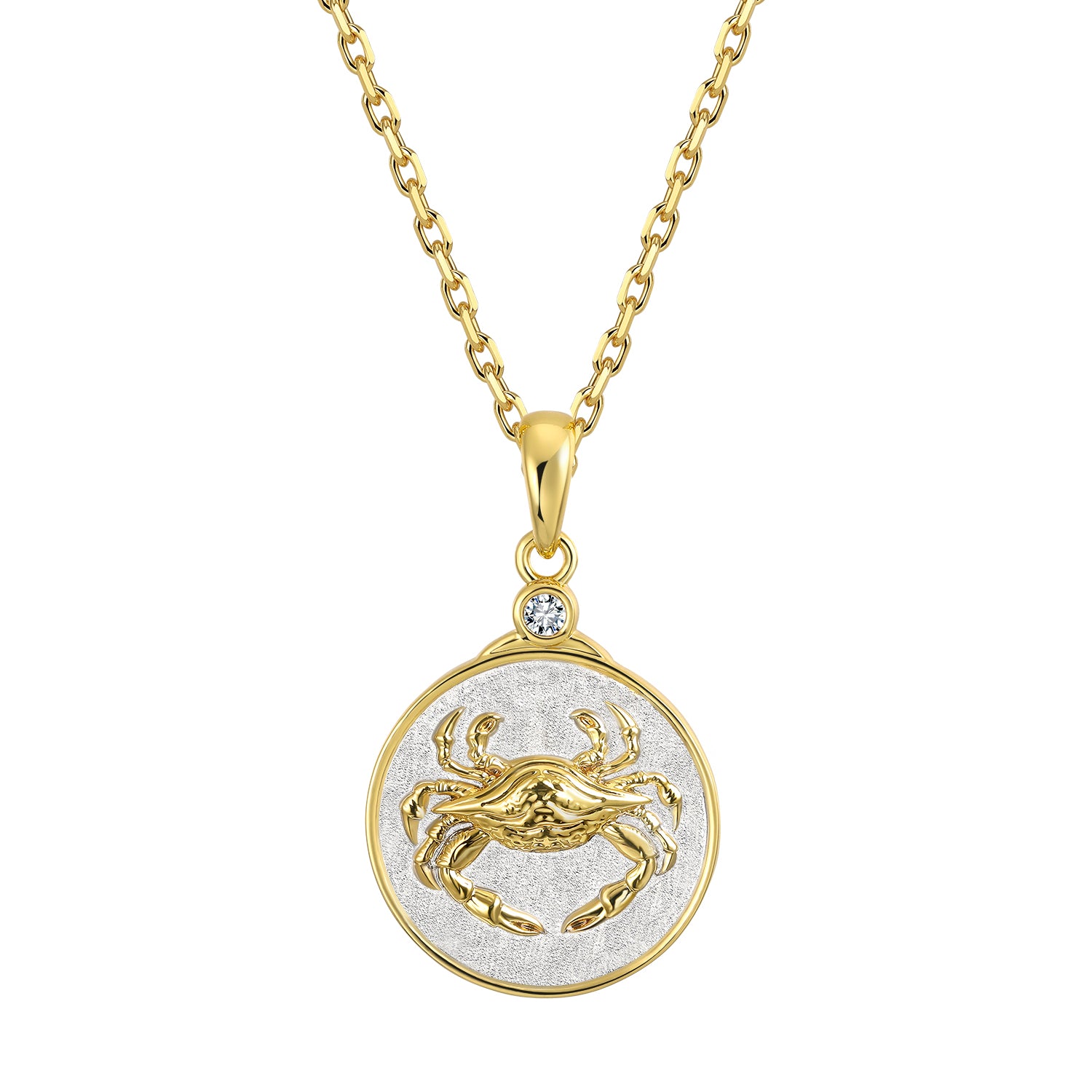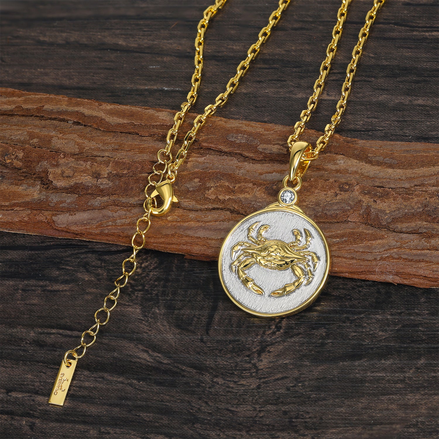 Our Wild CANCER pendant necklace features a beautiful detailed crab in gold on a sterling silver background. The reverse side shows the constellation set with crystal 'stars' and the astrological symbol as well.