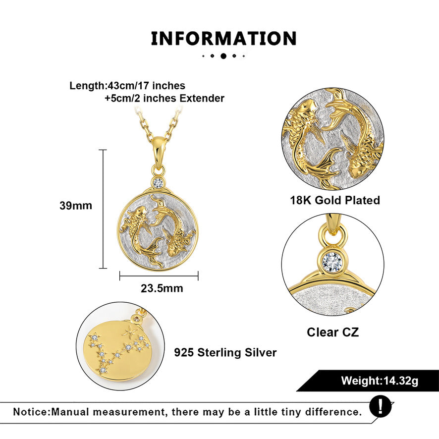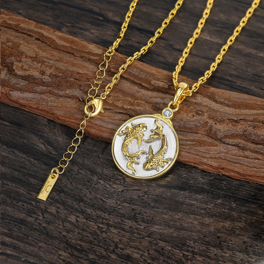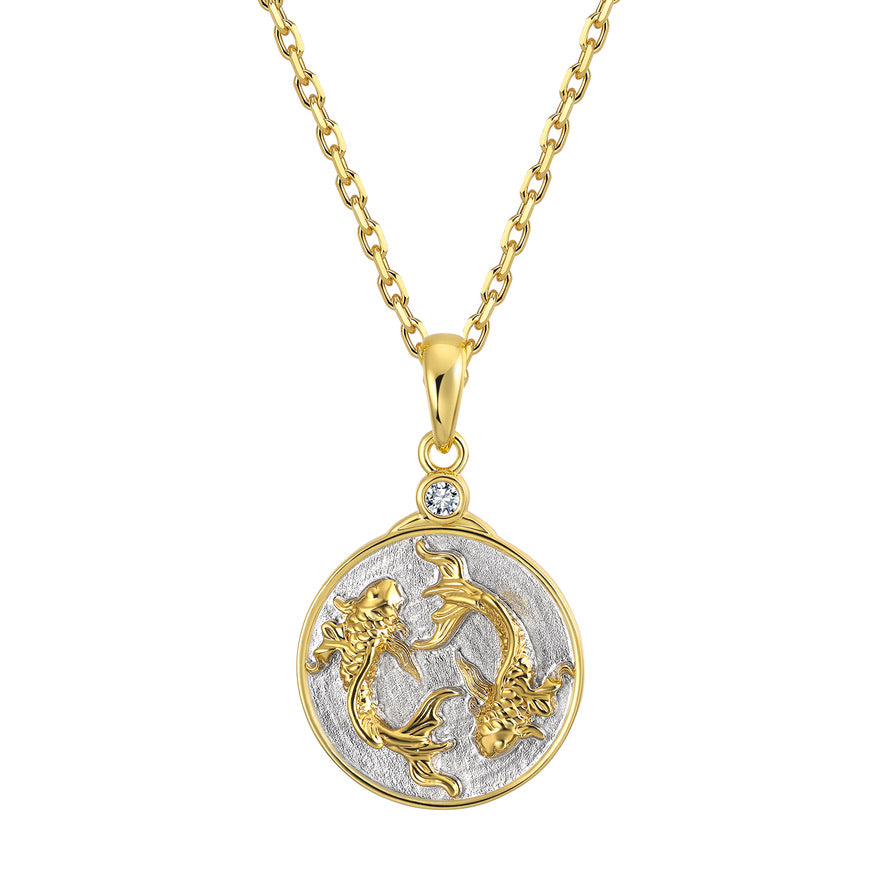 Our Wild PISCES shows a pair of elegant and detailed fantail fish swimming together in an ageless dance, cast in gold on a sterling silver background. We designed this in homage to the wilder side of the Zodiac, using animal symbols for each sign. The reverse side shows the constellation set with crystal 'stars' and the astrological symbol as well.
