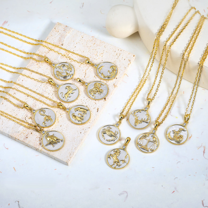 We created unique artisan designs depicting the signs of the Zodiac with a more 'wild life' approach. Each symbol is in a 3D relief on one side as a stunning, detailed pendant, and the reverse side shows the stars set in stones.