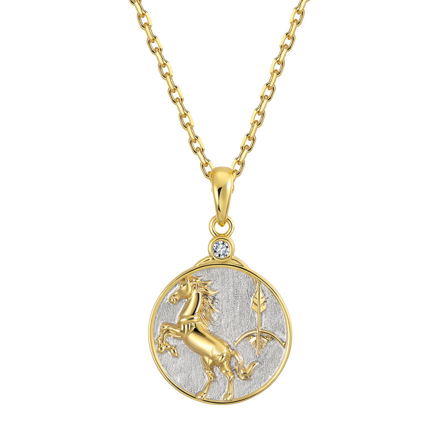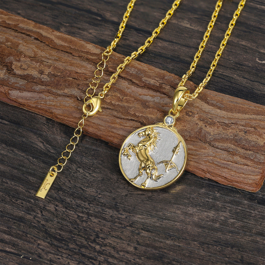 Our Wild SAGITTARIUS is designed in our wild way with a rearing stallion to represent the centaur and a stylized archer bow and arrow in gold on a sterling silver background. We designed this in homage to the wilder side of the Zodiac, using the animal symbol for each sign. The reverse side shows the constellation set with crystal 'stars' and the astrological symbol as well.
