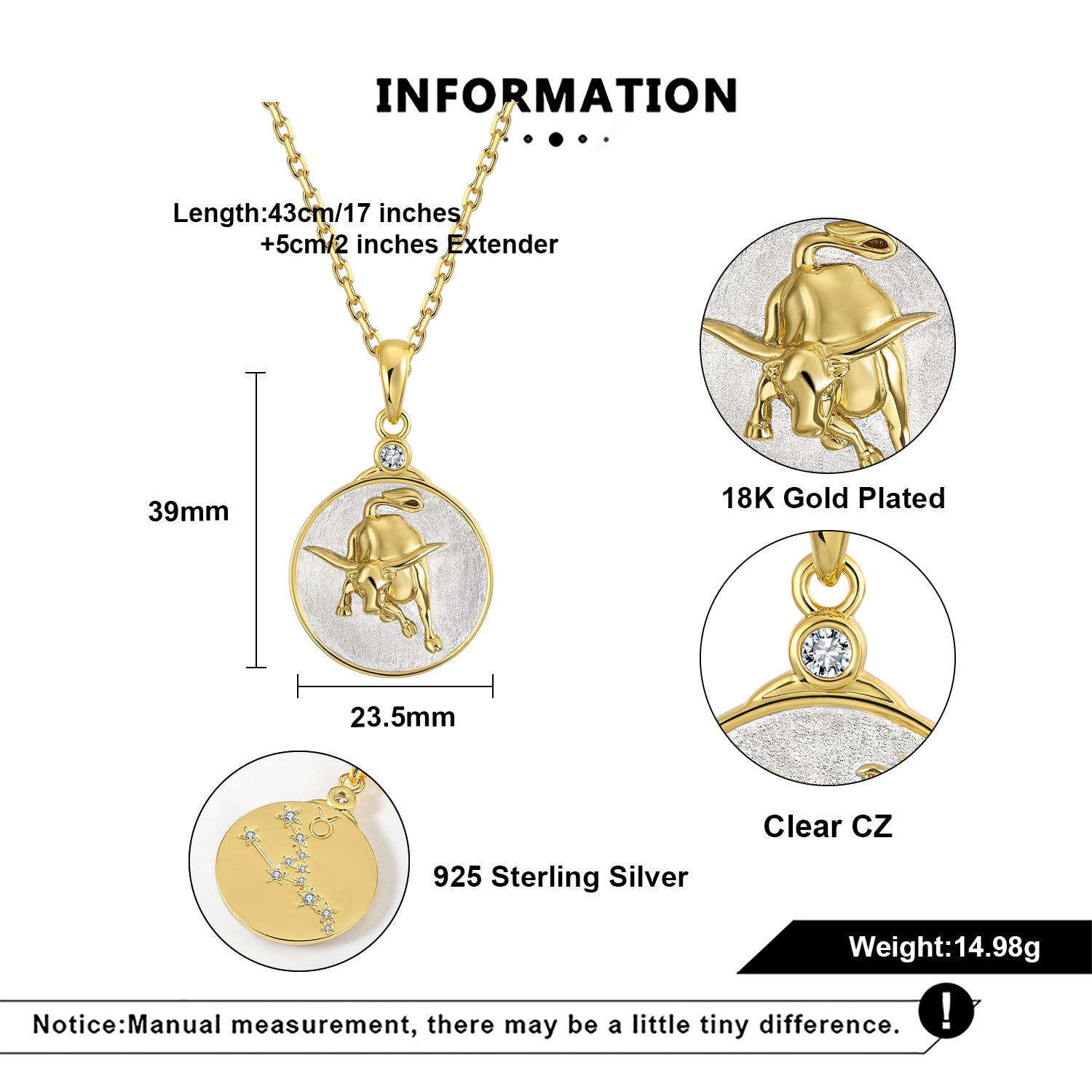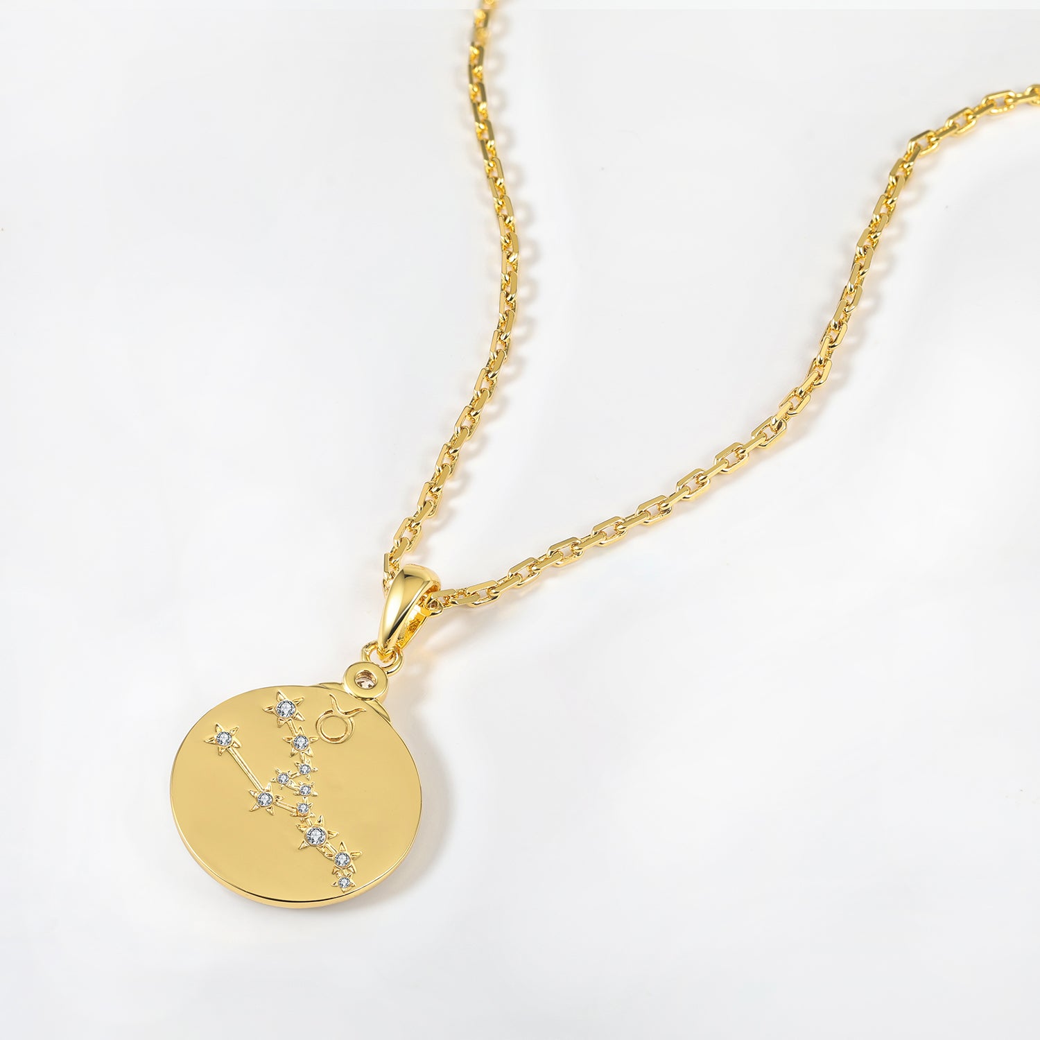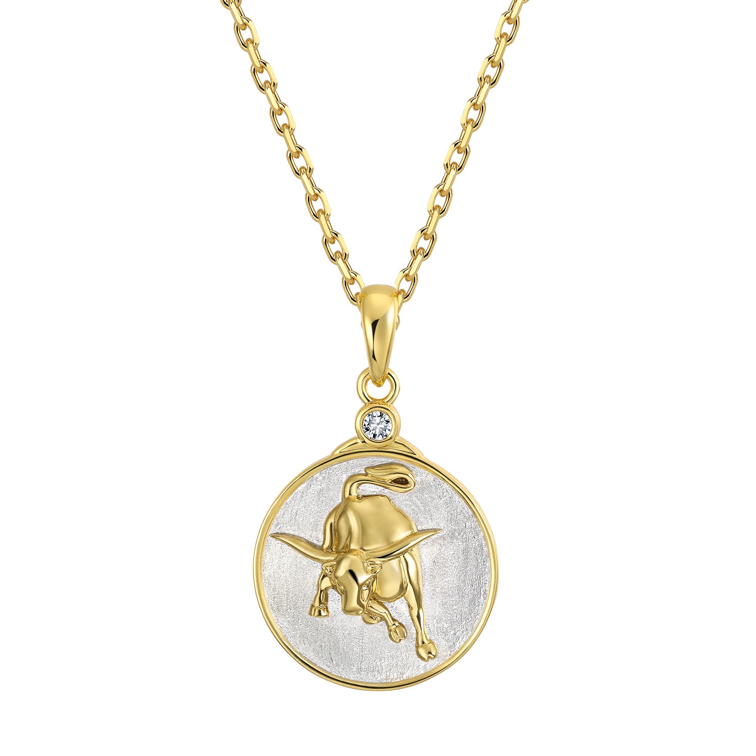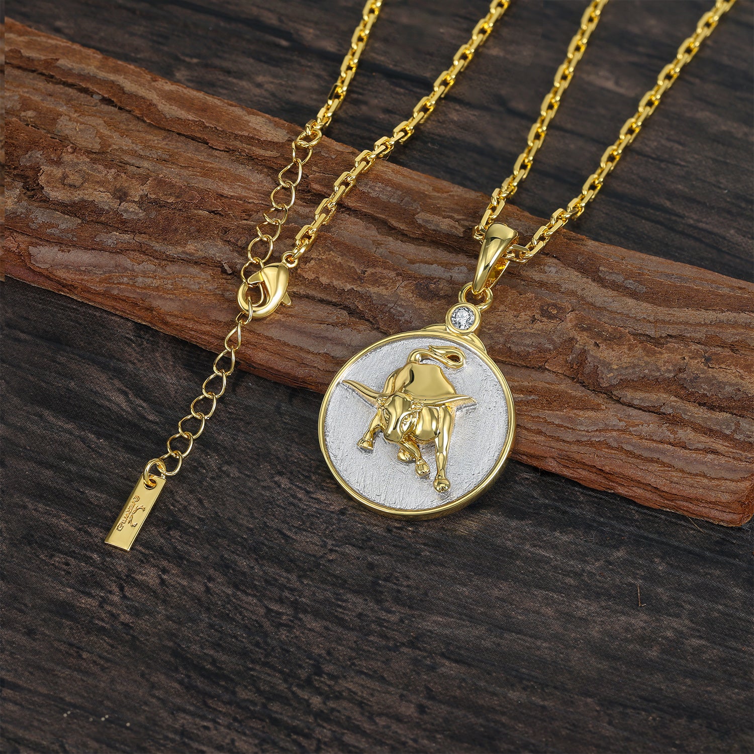 Our Wild TAURUS features a detailed charging bull in gold on a sterling silver background. The reverse side shows the constellation set with crystal 'stars' and the astrological symbol as well.