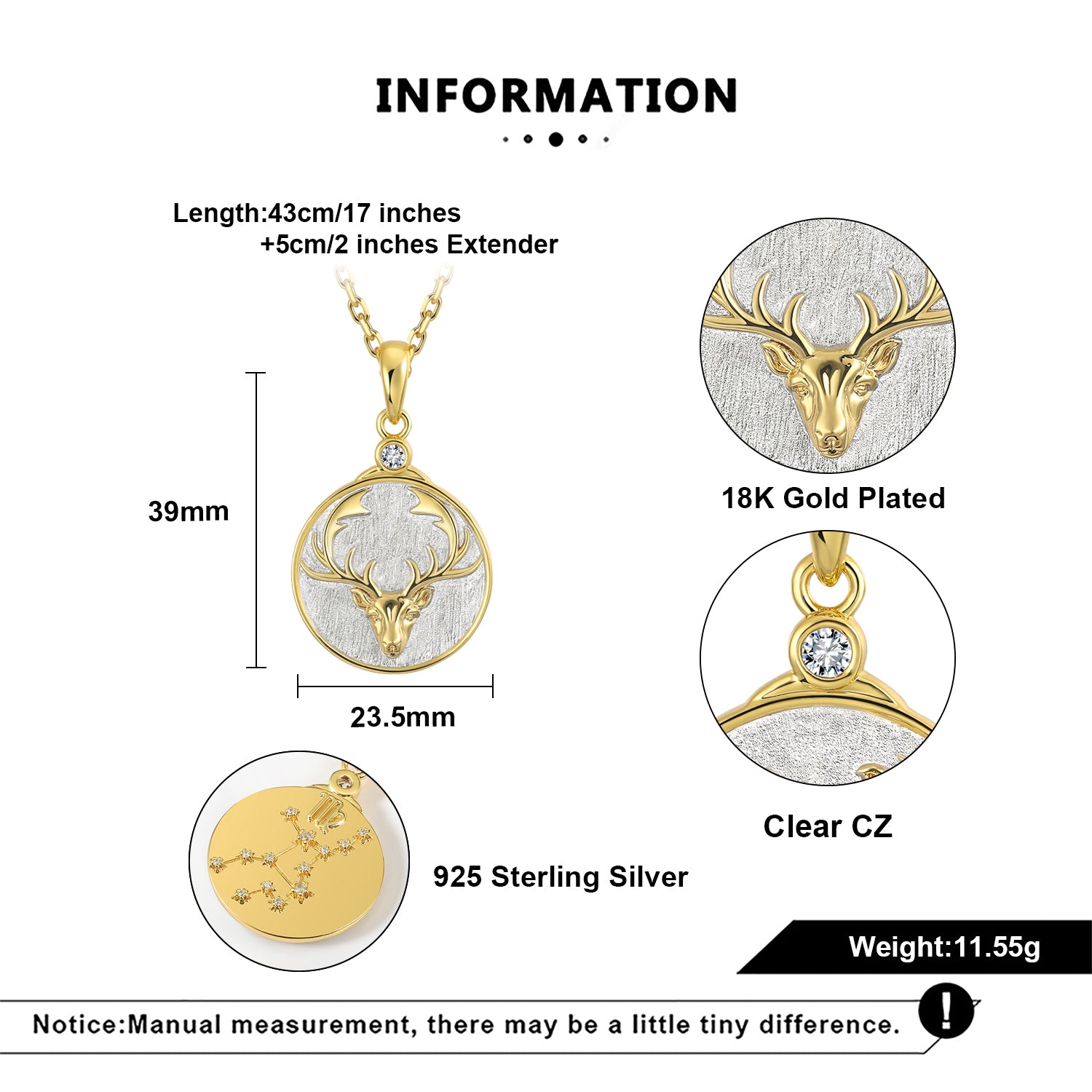 Our Wild VIRGO features an elegant Deer with curving antlers in gold on a sterling silver background. We designed this in homage to the Animal side of the Zodiac. The reverse side shows the constellation set with crystal 'stars' and the astrological symbol as well.